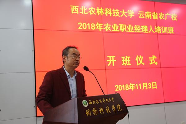 根据云南省农广校的培训安排,11月2日云南省农业职业经理人培训班在学院107报告厅开班,本次培训是云南省2018年的新型职业农民培育工程项目,前来培训的学员来自云南省近20个市县,包括8个少数民族共32位学员。他们中间有云南省首个“全国十佳农民”获得者,有养殖种植专业合作社的理事长,有生物科技开发公司的农民企业家等。学院党委副书记王力代表学院欢迎云南省农民企业家来学院学习考察,简单介绍了学校、学院的基本情况,希望学员们在杨凌期间学有所成,对云南的农业发展贡献杨凌力量。云南省农广校叶波科长代表全体学员发言,他说学员们都是云南省涉农产业的精英,对来西北农林科技大学学习仰慕已久,大家抱着强烈的愿望,渴求掌握更多的养殖方面的相关政策和管理技能。