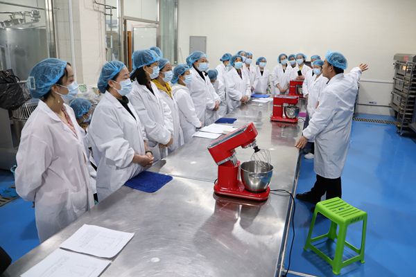 本次活动主要培训如何制作面包、蛋糕和蛋挞三个产品。在做好疫情防控的前提下,活动现场,大家身着工作服,戴着口罩,开启了制作美食之旅。随后,心灵手巧的女职工们在蛋糕师傅的带领下,亲自动手体验制作的乐趣,大家一起称量、搅拌、打发、拌匀,照步骤把食材混合在一起。制作过程中,烘焙老师也不断的给大家进行指导,及时发现问题,女职工们也更细致的学习了和面手法,保证了蛋糕的美味口感,整个活动现场飘满了香甜的味道,大家的笑容也如蛋糕般甜蜜。