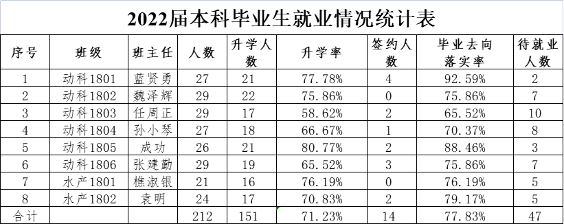 学院2022届毕业生415人(本科生212人、硕士研究生163人、博士研究生40人)。截至5月10日,学院毕业生总体去向落实率53.49%,本科生去向落实率为77.83%;研究生去向落实率为28.08%。