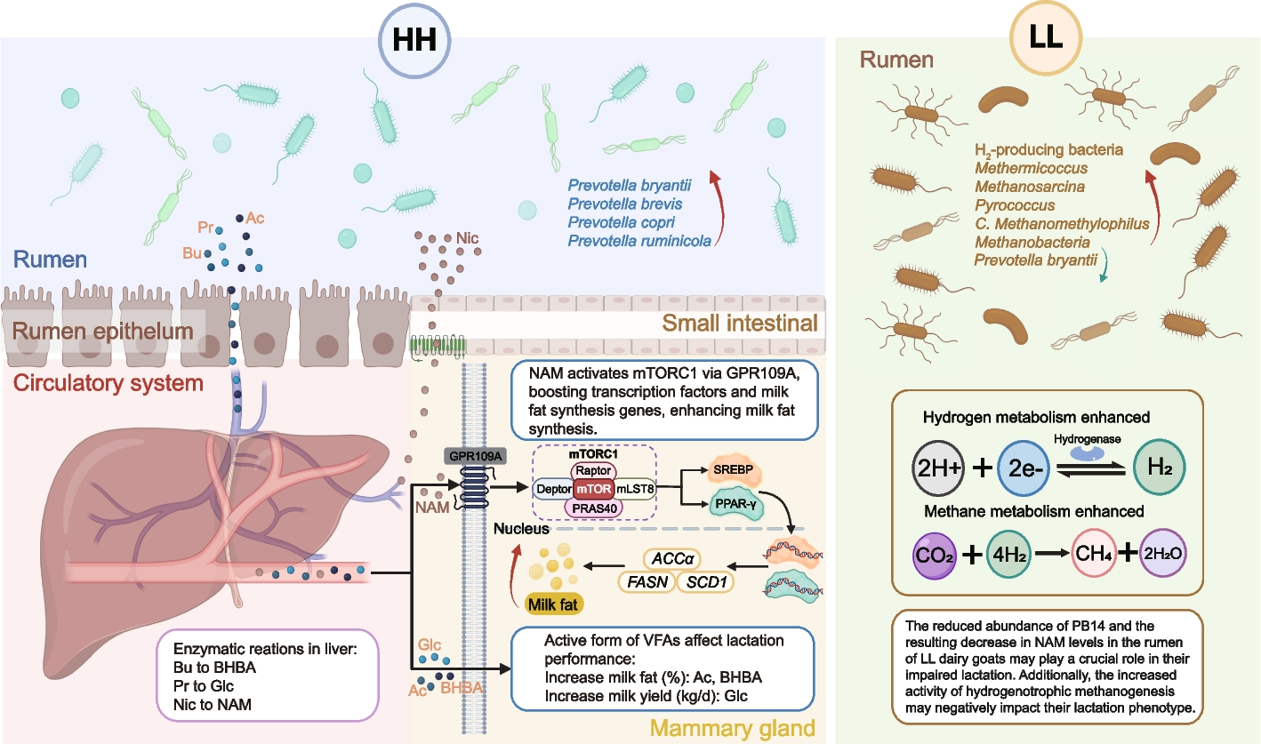 为了系统揭示高产高脂与低产低脂奶山羊瘤胃微生物及代谢差异,研究团队通过对比177只萨能奶山羊的泌乳表型,筛选出高产奶量高乳脂率与低产奶量低乳脂率两组群体,结合多组学分析发现:普雷沃氏菌属是驱动乳脂与产奶量同步提升的关键类群,其中布氏普雷沃氏菌表现最为突出。功能实验证实,布氏普雷沃氏菌B14能以L-天冬氨酸为前体合成烟酸,烟酸进入循环系统中后转化为烟酰胺。烟酰胺可通过乳腺上皮细胞表面的GPR109A受体,激活mTORC1信号通路,进而上调SREBP、PPAR-γ等转录因子,以及FASN、ACCα、SCD1等脂生成基因的表达,最终加速乳脂合成。但是在泌乳性能差的奶山羊瘤胃中,布氏普雷沃氏菌丰度显著降低,烟酰胺水平随之下降,直接导致乳脂合成能力受损。这一发现首次建立了瘤胃微生物代谢与乳腺脂质合成的因果关系,为微生物靶向干预提供了明确靶点。