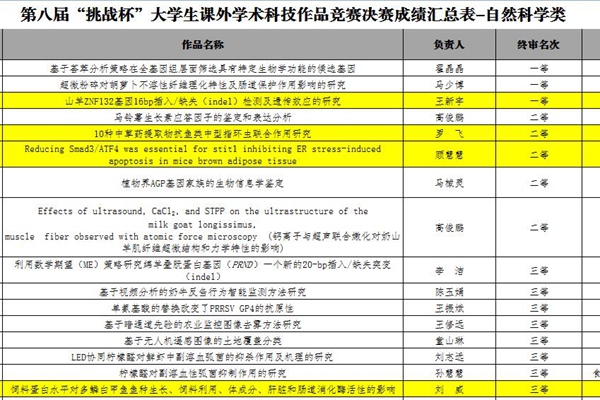 经过激烈角逐,探花系列 数位选手脱颖而出:动科136班王新宇同学以作品“山羊ZNF132基因16bp插入/缺失(indel)检测及遗传效应的研究”荣获一等奖;动科141班顾慧慧同学、水产132班罗飞同学获得了二等奖;水产141班刘威同学获得了三等奖;动科146班朱熙春同学、动科141班杨士珍同学、动科131班封同英同学均获得优秀奖的好成绩。据悉,以上部分同学将作为我校学生代表迎战省级挑战杯,切身体验科研,融入科研,用实际行动为学校学院增光添彩。