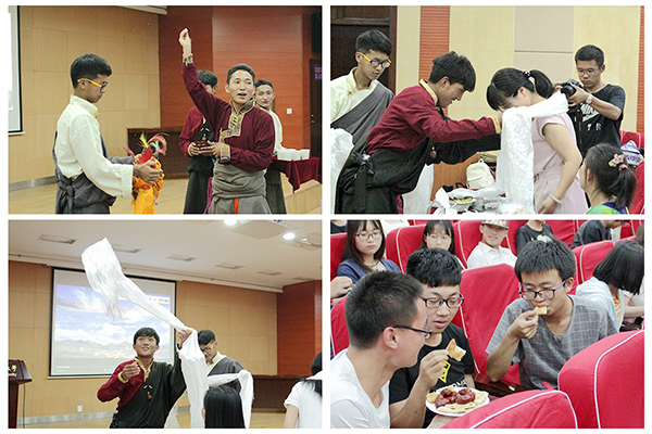 在第一环节“美哉·家乡情”中,各参赛队员协调合作,用灵活俏皮的情景对话,载歌载舞的表现形式对当地丰富多彩的民俗文化活动进行完美诠释。同学们身临其境,在民歌对唱中走进至美青海花儿会,在抒情悠扬的冬不拉声中置身大美新疆,在黄梅戏《天仙配》走进人杰地灵的安徽;在《走西口》中瞥见山西风情,在奶茶肉干中品味大美内蒙,在古风诗词中赏牡丹风韵、在动情朗诵中又见长安。热情好客的藏族同学们更是为评委献上哈达、斟满青稞酒,赢得了在场同学的阵阵掌声。