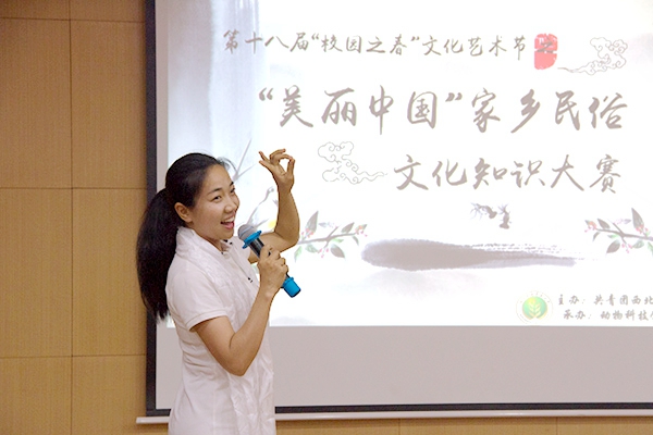 习近平总书记指出:“宣传展示中国特色,要讲清楚国家民族的历史传统与文化积淀。中国传统文化是中华民族的突出优势,是我们最深厚的文化软实力”,为深入学习贯彻习近平总书记系列重要讲话精神,大力弘扬中华民族优秀传统文化,近日,由校团委主办,探花系列 承办的第十八届“校园之春”文化艺术节之“美丽中国”家乡民俗•文化风采大赛决赛于北绣北报告厅隆重举行。校团委副书记师燕妮老师、动科学院党委副书记王晓娟老师作为嘉宾莅临现场观赛,人文社会发展学院周仕慧老师、卫丽老师,党委宣传部刘威老师担当大赛评委。经过初赛的层层选拔,共有来自西藏、青海、新疆、河南、安徽、山西、西安、内蒙的8支队伍脱颖而出,百余名学生现场助阵,为参赛队伍加油助威。