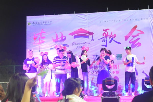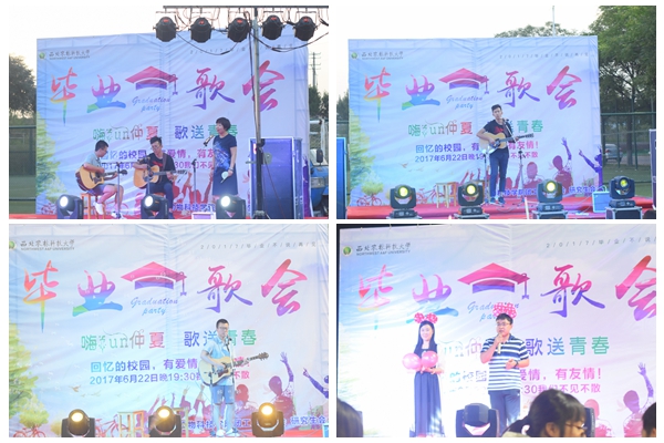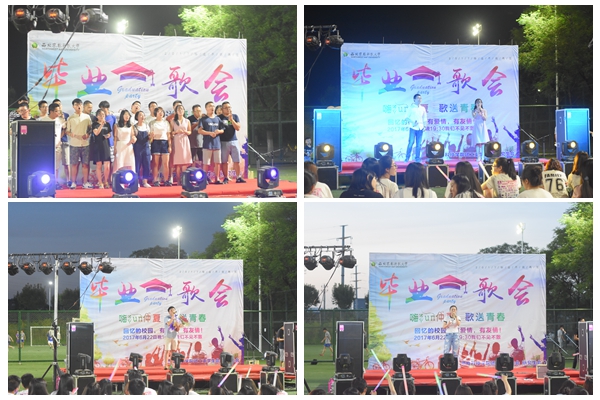 晚会节目多姿多彩让人目不暇接,有活力四射的本科生班级合唱、舞蹈表演,也有热爱音乐的毕业生借优美的歌声传送毕业的祝福,更有暖心的双人情歌对唱,让人感受到慢慢的幸福……王晓娟副书记和赵军、高遥两位同学合作的《吉姆餐厅》,其歌声的优美和琴声的悠扬让现场掌声雷动;辅导员老师们一起带来了合唱《爱我中华》,旨在为毕业生上好最后一堂爱国主义课程,这激动人心的歌声也激励着在场的同学们更加勇敢地追逐梦想争取进步。