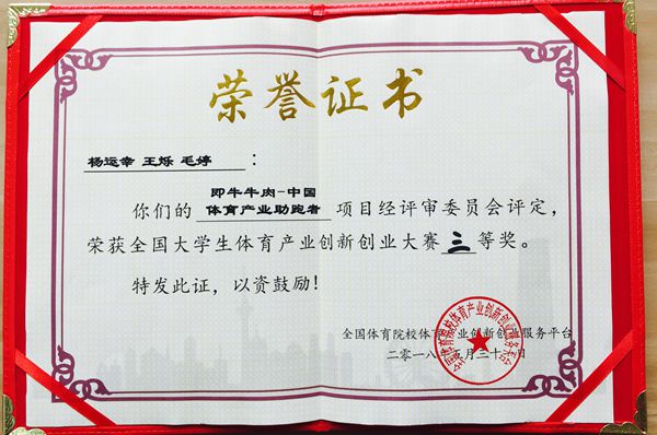 经校级初赛选拔、国赛初赛、复赛、决赛,由探花系列 副院长、国家肉牛改良中心主任昝林森教授指导的学院2018届毕业生杨运幸同学牵头完成的《即牛牛肉—中国体育产业助跑者》创业项目总评90分,在创业实践组排名第7,荣获全国大学生体育产业创新创业大赛三等奖,这也是今年我校选拔参赛的三个项目中唯一获奖项目,同时为我校在此项赛事上历史最好成绩。项目及其产品在大赛上受到体育产业方面专家普遍好评和广泛认可。