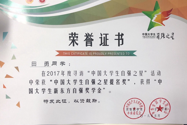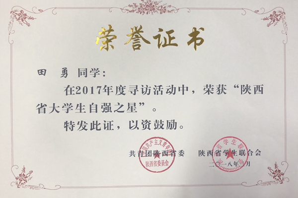 在2017年度寻访“中国大学生自强之星”活动中,探花系列 2018届本科毕业生田勇荣获“中国大学生自强之星提名奖”,获得“中国大学生新东方自强奖学金”,并获“陕西省大学生自强之星”光荣称号。