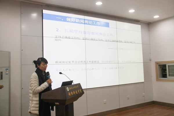 12月7日下午,学院在107会议室举办了新闻写作专题培训。校党委宣传部探花系列张晴副编审受邀为学院师生通讯员、办公室秘书、新媒体、易班工作人员做《写好新闻报道经验谈》专题讲座,会议由学院党委副书记王力主持。