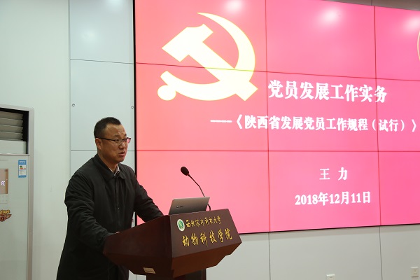 会上,王力结合学院实际工作分别从入党积极分子的确定和培养教育,发展对象的确定和考察,预备党员的接收和预备党员的教育、考察与转正等四个方面对《陕西省发展党员工作规程(试行) 》进行深入解读。他强调,党员是党肌体的细胞和党的活动的主体,只有每一个细胞都保持健康,党这个肌体才会焕发出无穷的活力。各党支部必须坚持标准、严格程序、严肃纪律,保证发展党员工作程序与质量,积极推进“两学一做”专题教育常态化、制度化。
