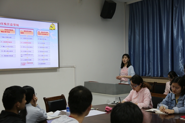 党务秘书胡巧娟强调了此次培训的重要性,对线上培训安排和线下培训计划进行详细介绍,要求全体学员严格遵守学习纪律,尊崇诚信道德,积极完成各项学习安排。同时,胡巧娟结合工作实际,分别从递交入党申请书、入党积极分子的确定和培养教育、发展对象的确定和考察、预备党员的接收、预备党员的教育考察和转正5个步骤解读了《陕西省发展党员工作规程(试行),希望全体学员珍惜学习机会,强化理论武装,在学习和工作中发挥先锋模范作用,力争早日成为一名合格的共产党员。