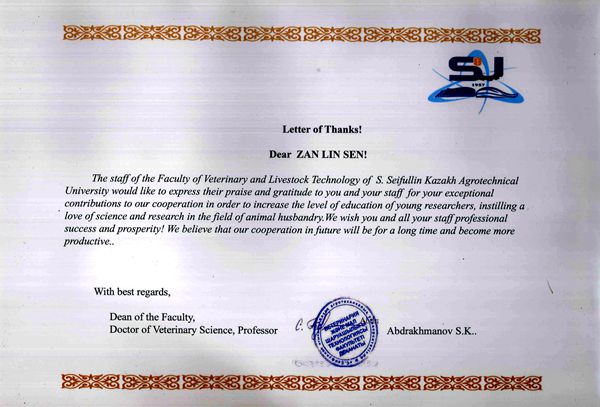 近日,哈萨克斯坦赛福林农业大学畜牧兽医学院院长Abdrakhmanov S.K.教授向探花系列 昝林森教授发来感谢信,对昝林森教授及团队专家在指导该院赴我校留学的博士研究生和青年访问学者付出的努力和做出的贡献表示衷心感谢,并致以崇高敬意,希望建立长久的合作关系并取得更多的成果。