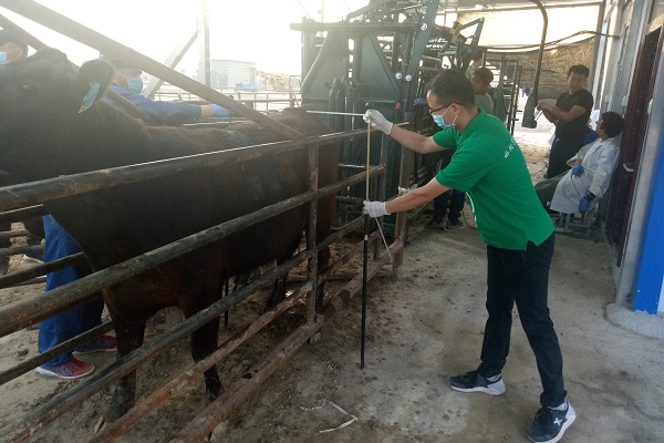 随后学院队伍与新疆农业大学一行社会实践小分队前往该公司第五、七育种场,切实参与牛场的各个生产环节。该场总共有3700头牛,主要以繁育为主,喂料、喂水、配种均采用全国最先进的技术。队员们在此开展了为期两天的实践活动,分别在第五、第七育种场完成了犊牛保育工作、精料加工、安格斯肉牛的核心育种群的选择、外貌评定和体尺测量等工作,并在实践过程中积极与场长沟通,利用专业知识解决相关问题。
