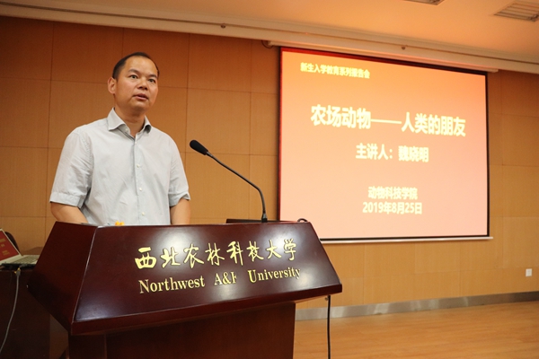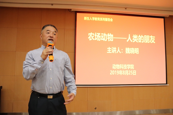 8月25日下午,学院举办新生入学系列教育报告会之“农场动物——人类的朋友”。宁夏晓鸣农牧股份有限公司董事长魏晓明先生担任主讲人。会议由学院党委书记曹军会主持,院长姚军虎,学院党委副书记王力,2019级全体新生及部分新生家长参加了本次报告会。