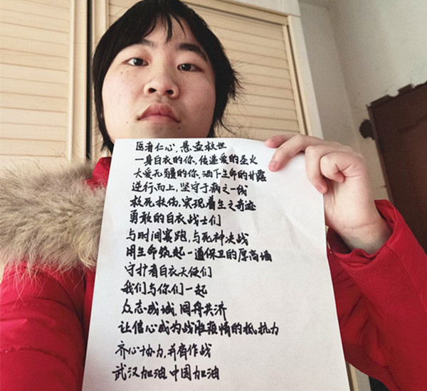 水产1601班张勇(随州)说:世上没有从天而降的英雄,只有挺身而出的凡人。这次疫情让我看到中国有着最好的和最朴实的人民,他们都很棒。我们要相信国家的力量,相信社会的温暖,相信我们这个民族的气节,我们经历过战乱、经历过外侵、经历过各种天灾人祸,我们都撑过来了,更何况如今的中国空前强盛,会越来越好的。疫情无情,人间有情。