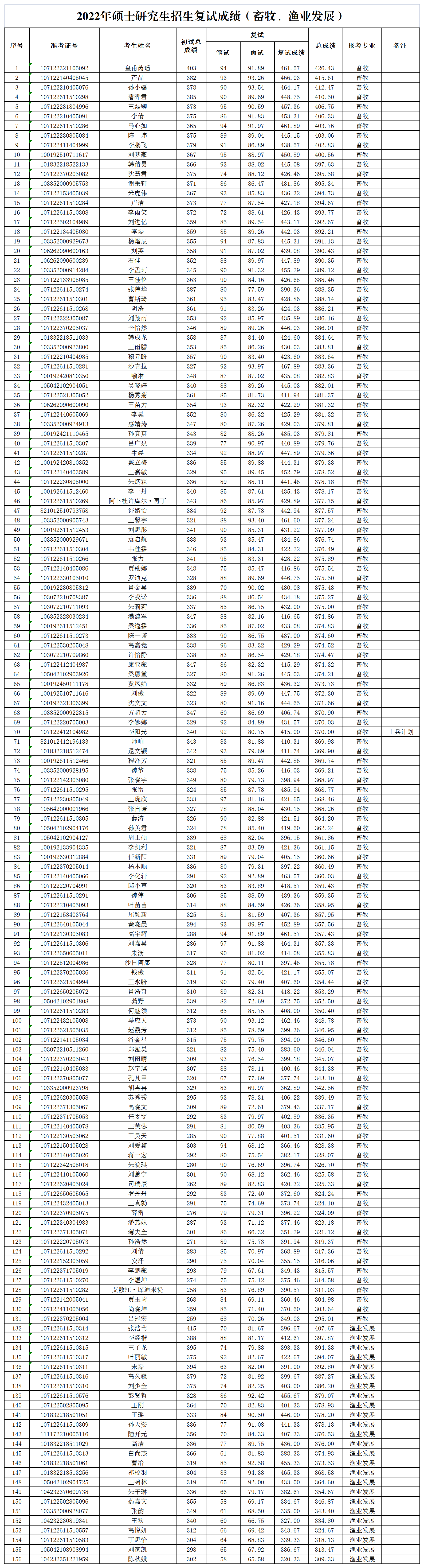 关于2022年硕士研究生招生复试成绩的公示(畜牧、渔业发展)
