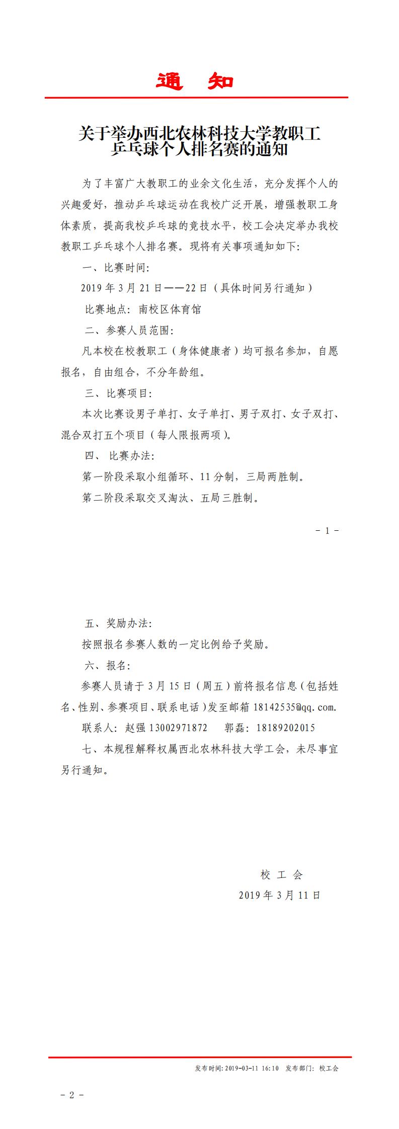 关于举办西北农林科技大学教职工乒乓球个人排名赛的通知
