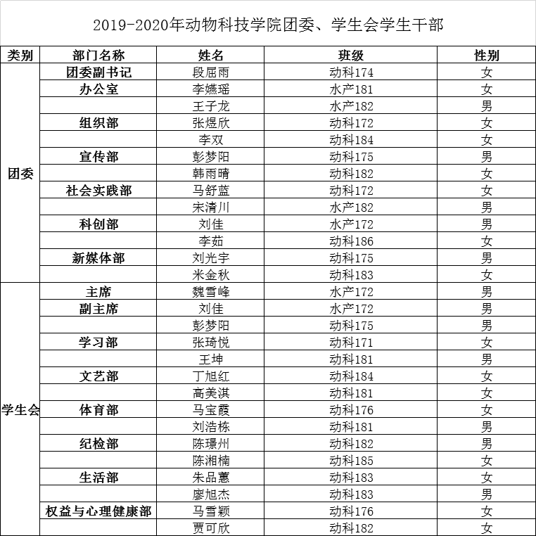 按照学校工作安排,经学生个人申请、学院团委、学生会、研究生会学生干部换届领导小组进行资格审查,提交2019年7月4日“2019-2020学年动科学院团委学生会学生干部换届大会”选举,建议由下列人员分别作为2019-2020学年动科学院团委、学生会、研究生会学生干部,现公示如下: