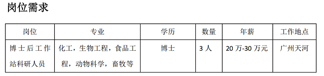 广州天科生物科技有限公司是一家专业从事新型饲料添加剂的研究与应用的国家火炬重点高新技术企业。企业技术中心,现有实验室面积 1000 平方米,拥有多台套先进实验仪器和拥有较好的饲料添加剂产业化开发平台,先后被广东省科技厅认定为广东省矿物元素络合物工程技术中心,广东省经贸、发改委等部门认定为省级企业技术中心。2015 年经国家人力资源社会保障部和全国博士后管委会批准设立博士后科研工作站,现面向全国招收博士后研究人员,提供优厚的工资福利待遇和广阔的发展空间,在站期间表现优异者可在出站后继续留下工作。欢迎广大有志于畜牧事业的优秀博士毕业生来我司从事博士后研究工作。