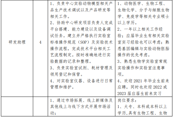 北京实验动物研究中心有限公司(以下简称“中心”)成立于1981年,是国家科技部倡导下建立的四个国家级实验动物研究中心之一,具有独立法人地位的全民所有制科技企业,现隶属于北京市科学技术研究院。主要从事实验动物产品的研究、开发、应用和相关技术服务。中心致力于满足在京及周边区域生命健康研究及生物医药产品研发需求,成为北京市生物医药产业发展的专业化实验动物支撑力量。中心将秉承诚信务实,求真创新,合作开放,共建共享的企业精神,建设成为科研人员和企业家满意的实验动物创新服务平台。因业务发展需要,中心目前针对以下岗位面向高校、企业和科研院所诚聘以下人才。