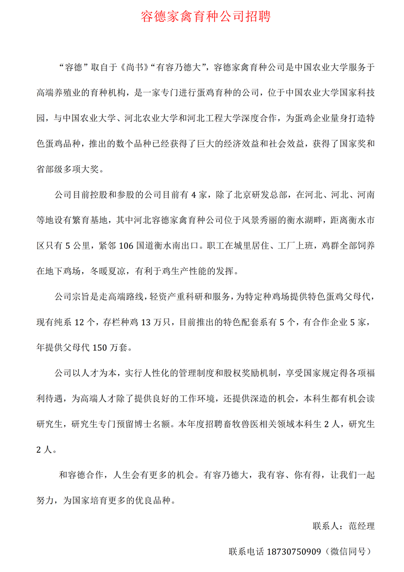 河北容德家禽育种公司招聘信息