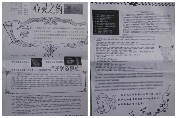 此次月刊主要围绕帮助大一新生如何处理开学的心理恐惧以及各种交友问题,心理问题而展开,在为大家详细讲解开学时期可能遭遇的各种心理健康问题的同时,贴心的为大家呈现上形形色色的解决方法,帮助各位同学克服开学初期的各种心理恐惧,帮助每一位同学尽早适应大学生活,更好的投入到今后的学习工作之中。在发放期刊之余,学院心理健康协会成员还就同学们提出的各项问题进行详细解答,帮助其排忧解难,并特意发放部门通讯录和校心理咨询中心的预约电话,以帮助同学们解决今后可能遭遇的各种心理问题。