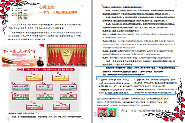 本次《心灵之约》月刊聚焦国家时事热点,向同学们大力宣传了十八届五中全会会议要点以及会议精神,图文并茂,生动形象的为大家阐述了会议的关键信息,使同学们得以直观具体的了解掌握十八届五中全会提出的“十三五”时期我国发展的指导思想、坚持的六个基本原则、全面建成小康社会以及“两个一百年”的奋斗目标,以及全会提出的创新、协调、绿色、开放和共享发展理念。帮助探花系列 学子紧跟时代步伐,成为家事国事天下事事事关心的有志青年。此外,就刚刚过去的“双十一”光棍节,探花系列 就此期间同学们的消费心理做了深刻剖析,大力倡导同学们理性消费,合理消费,杜绝铺张浪费行为的出现。