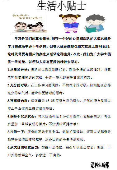小贴士通过电子查阅及实践总结,从起居、饮食、运动、科学用脑等方面出发,向同学们提出了几点中肯实用的小妙招。小贴士建议同学们在生活中应该注意作息时间,并应注意合理饮食,适当放松脑部、释放身心能有效驱除困倦感等。小贴士言简意赅,条理清楚,帮助同学们以饱满的精神状态迎接新生活。水产152班王文同学很喜欢小贴士:“我们都知道春天容易犯困,可是就是没系统地了解过,更不用说去改善了。这种小贴士很贴心,让我能时刻提醒自己,慢慢改变生活习惯,这样学习效率也大大提升了。”