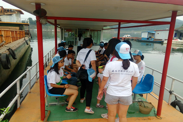 古朴的建筑和悠久的文化底蕴给小镇增添了浓厚的历史感,调研服务队沿铺满青石板的小路到达瀛湖边坐船,船儿前进在潺潺山水间,清澈的湖中出现一片网箱,“莲花餐饮集团,水产有机养殖垂钓中心”矗立其中。在当地渔民的指引下,队伍沿网箱参观鱼苗养殖情况,渔民一路上对调研队员们介绍鱼苗的生长情况,队伍沿着网箱考察学习,提出问题,记录答案。队员们对品种多样的鱼苗和自然有机的生长环境留下深刻印象。队员陈晓鸿表示,“渔民们使用的机械自动投食是队员们课堂上学习到的知识,在今天亲眼见到后,对其有了更深入的了解。”