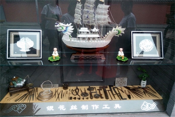 成都文殊坊街上遍布形形色色大大小小的工艺品商店,而道安银花丝店面只是其中小小的一家,但是这毫不起眼的小店却拥有独特的魅力,吸引了众多的游客于其内参观浏览。走进去,各种款式造型的银花丝作品在灯光下熠熠生辉,花丝呈现细密的纹路,让人忍不住走近细瞧。店员向队员们介绍道,银花丝这项工艺目前已有1700多年的历史了它起于殷商时期,盛于明清时期,它与蜀绣、竹编、漆器一起被誉为成都的“四大名旦”,自08年起被批准列为国家级非物质文化遗产名录。银花丝的制作工艺十分繁复,银丝最细的仅有发丝的一半,粗的也仅几毫米。制作时需把白银抽成不同粗细的银丝后,按照已制作出的图形边框,用掐丝、填丝、织编和累丝四大技法对中间的图纹进行填充和编织,再运用填丝、垒丝、穿丝、搓丝焊接等综合技术,才能够制出一件精美的银花丝产品。这一过程耗时之长,手法之精细,是现代工场工艺所不能比拟的,这也彰显出这一民间工艺的技术和艺术含量。队员们在欣赏精妙绝伦的银花丝艺术品之余,无不赞叹于手艺人精湛的手上工夫和深刻的艺术感悟,也更加因这一传统工艺无人继承而感到惋惜。