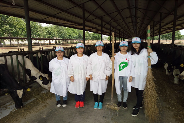 泌乳牛是牛奶的主要产源,负责泌乳牛的张师傅介绍,厂里有从澳大利亚进口的荷斯坦牛,到大部分还是中国荷斯坦牛,每头最多可以产奶50kg/天。和大部分动物一样,奶牛也是一天投料三次,等最后一次投完料,已经是晚上十一点多。不过由于挤奶间设备有限,有的牛是先挤奶后进食,有的是先进食后挤奶。调研队队员根据奶牛的习性分组,分别承担驱赶奶牛到挤奶台和推料两个过程。队员要不断铲料,为的是让所有料草都能充分被奶牛食用。除此之外,观察牛进食的过程也很有必要,通过进食速度和进食量可以判断牛的健康状况。紧接着,队员们在张师傅的引导下也亲自动手参与了奶牛的投料和挤奶,在张师傅的提示和帮助下,每一位队员都亲身体验了在奶牛饲养中的基本流程。