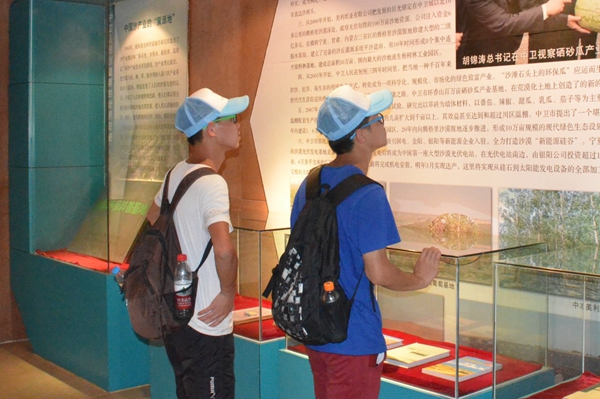 到达目的地后,首先映入队员们眼帘的是黄河与大漠,包兰铁路自两者中间穿过,将其分开。在参观过程中,队员们了解到沙坡头原是一片荒芜的沙漠,在治沙先辈的努力下如今的沙坡头绿树葱茏,早已不见当初的荒凉景象。沿线走过,队员们看到包兰铁路两旁高大挺拔的树木,不禁惊叹连连。继而,队员们又参观了沙坡头博物馆,在这里,成员们了解到了治沙的历程,一张张老照片上写满的是治沙的艰辛与不易。在观摩‘麦草方格’治沙法后,队员谭天元感慨道:“我们应该做的不仅仅是学好老一辈科学家们的治沙经验,更要把前辈们的精神毅力传承下去。”