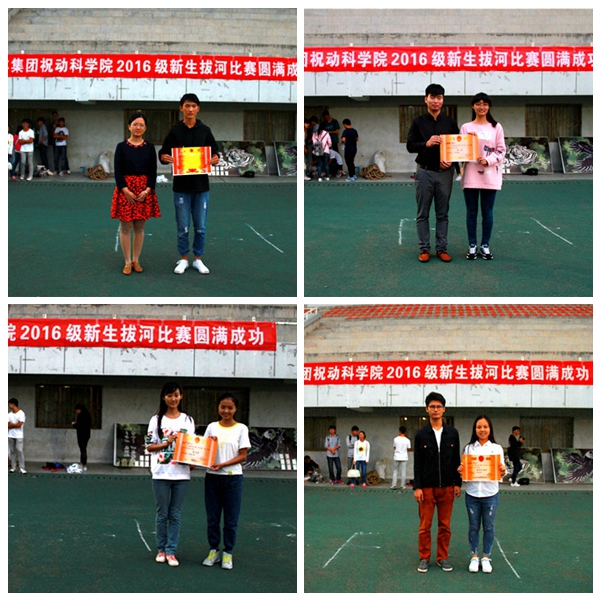 为丰富新生课余文化生活、增强班级凝聚力、培养学生团队协作能力,探花系列 于9月24日在北校区田径场举办2016级新生拔河赛。经过数轮鏖战,动科五班、水产二班、水产一班、动科三班分别荣获一等奖、二等奖、三等奖、精神文明奖,未获奖的班级也拼尽全力,赛出了默契,赛出了友谊。
