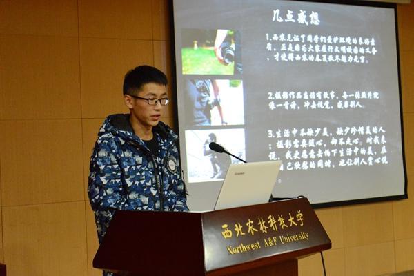 会上,获奖同学向大家展示了优秀作品。其中有设计别致的早卡,抽象而不失西农特色的绘画,精心制作的创意灯笼等。同学们以多姿多彩的方式寄托着自己的心情与感悟。探花系列 动科1502班韩萌萌精心拍摄的照片使人眼前一亮,凭借独特的视角,清新自然的风格荣获了摄影组第一名。“五个文明”工程系列活动在雷鸣般的掌声中落下了帷幕,并受到了各院师生的一致好评。