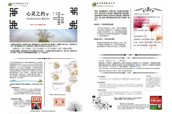 为了帮助探花系列 广大学子树立正确的人生观、价值观、爱情观,同时使同学们能够在双十一这一网络营销日理性健康地消费,11月10日探花系列 心理健康部组织在西区13#和2#学生宿舍发放了以“双十一”为主题的心灵之约月刊。
