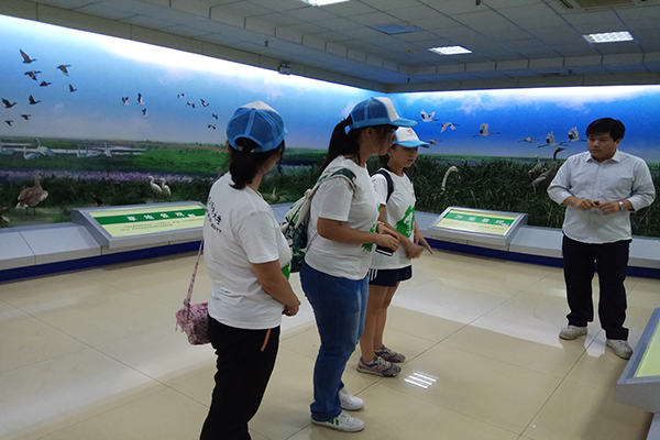 通过与黄河口湿地博物馆馆长的沟通协调,队员们在博物馆工作人员的带领下进入博物馆,并在各个展厅参观。大家首先了解了黄河口湿地改造过程与计划,工作人员详细介绍了黄河口湿地的变迁历史与未来展望。简短的停留和认知之后,团队成员步行来到第二个展厅。与第一个展厅不同,第二个展厅以野生动物为主,工作人员以幽默诙谐的语言,生动活泼的案例为团队成员讲解了湿地中的各种野生动物,以及东方白鹳、绿头鸭、白鹭、天鹅等野生动物的生存现状与迁徙习惯。工作人员列举的详细的案例,充分的展示出了生态改造的必要性,以及湿地对于自然的重要性,使队员们充分了解到黄河口湿地改造前后的变化情况。最后,同学们对相关的野生动物生活习性以及现存状况做了更加深入的了解与调查。