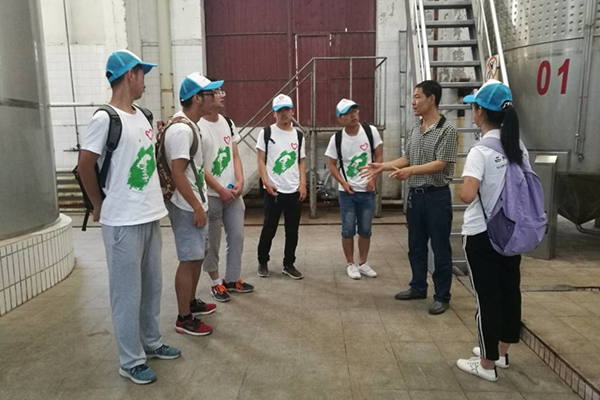 队员们还深入探索了武威当地著名的白酒企业——皇台酒厂的发展模式。皇台原来是武威白酒行业的支柱企业,但随着行业竞争加剧、资金亏损,公司的业绩日渐西落。2013年,公司做了一个重大决定,改变其单一的生产模式,探索发展葡萄酒产业。领导和员工上下一心,终于生产出了酒厂的第一瓶葡萄酒,自此,皇台已经自发生产了好几种葡萄酒。队员们参观了葡萄酒生产的各个车间,从压榨车间到发酵车间,再到罐装车间。过程中,负责人详细介绍了压榨葡萄时从装载到传送带运输等一系列的流程。他说,做好一杯葡萄酒最重要的环节在于它的发酵,温度,湿度,再到发酵工艺,每一步都决定了它最后独一无二的口感。从一无所知到轻车熟路,无一不体现出皇台作为凉州老一代酒厂为适应时代发展,探索革新的可贵精神。