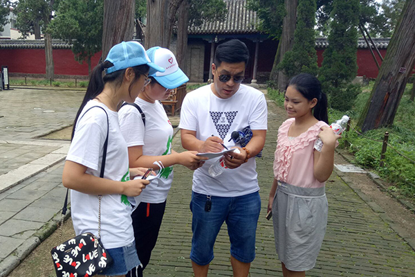 通过与孟庙工作人员的协调与安排,团队成员进入孟庙后在孟庙工作人员的带领下,进入孟庙进行一带一路调研活动。在前期的调查中,成员们发现,人们对“一带一路”知之甚少。针对调查问卷出现的问题,成员们重新修改了宣讲材料。采用通俗易懂、幽默风趣的语言和精简的话语,在较短的时间里,让人们对“一带一路”有更深的了解。成员们还特地准备了“一带一路”趣味问答活动。让参与者抽取箱子中的问题,如果答对,就可获得一瓶矿泉水。用这种趣味的活动方式,吸引了许多家长和孩子的参与。