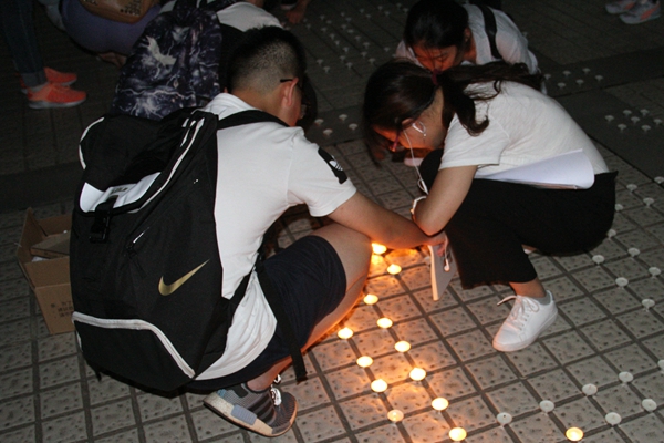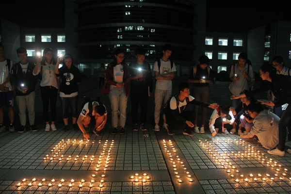 活动过程中,同学们点燃“9·18”字样的白色蜡烛,在闪闪烛光中,庄重默哀,表达自己对国耻的悲痛与悼念。除此之外,探花系列 四名自愿者自发组织诗词朗诵,用壮丽的言语抒发爱国复兴之志。活动现场吸引了各院同学,大家纷纷驻足默哀,气氛沉重。