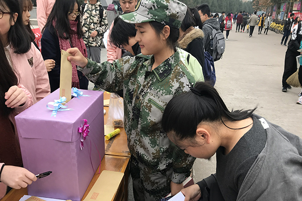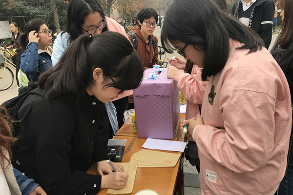活动前期通过传单,网络平台,活动画板等方式对本次活动进行了广泛的宣传,达到了极佳的群众普及效果,吸引了一大批同学参加时光慢递活动。期间,带着自己的“慢递”来现场投信的同学络绎不绝,他们将写满对未来的期望的信存入信封中,郑重地投向了未来。热闹非凡的场面也吸引了不少路过的同学驻足,并在现场挥洒笔墨,诉说入校心得,分享大学生活,感慨青葱岁月。他们将感情融入文字,将真情藏于心间,等待时间的洗礼。