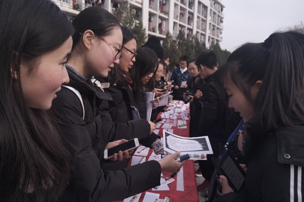 本次活动由探花系列 与人文、外语、信工三院组织部联合举办,包括合唱活动和知识问答两个部分。合唱活动采用新颖的“快闪”形式,邀请了四十名17级的同学们参加。当端庄悠长的长号声响起时,人群中合唱队的同学们立刻排好阵型,唱起了嘹亮的红色歌曲《映山红》和《在太行山上》,吸引众多同学们驻足观看。演唱结束后,合唱队的同学迅速离开,观看的同学们发出阵阵赞叹,掌声接连不断。随后,“一二九历史知多少”问答活动在西雕展开,同学们踊跃参与竞答,现场秩序井然,气氛热烈。参与活动的同学们纷纷在宣传横幅上签下自己的名字,表示了对革命先烈的崇敬以及对革命精神的赞叹。