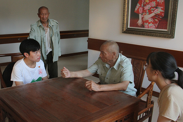 “你们是大学生吧!”正在队员们准备进屋时,身后突然传来了浑厚有力的声音。一位面容坚毅的老兵在身后叫住了队员们,并热情的拉着大家围坐在大厅中的桌子边,开始讲述他的故事。同京飞老人已年逾90,身着军装,腰板挺直,声音浑厚,口中吐出的是70年前那段烽火岁月……“日本人有飞机,打到最后我们全连只剩6个人,但是大家还是拼到了最后走一刻。”1942年,同京飞跟随部队奔赴山西抗战前线,并在惨烈的战斗中英勇作战。抗战胜利后,国民党大局进攻陕北,在与胡宗南部的战斗中,他曾与战友在战壕里三天三夜滴水未进。“只要是想起牺牲的战友们我就伤心,天天说话玩耍,一场战斗之后可能就没人了……但是我们也从未害怕过,老百姓想要过上好日子,就要先把敌人赶走!”说到动情处,老人眼里泛着泪光。听闻队员们来自西北农林科技大学,老人更加精神了,原来他的孙子正于我校攻读硕士研究生。“你们年轻人,大学生,一定要好好读书!将来造出比国外更先进的飞机导弹,我们国家才不会被欺负!看到现在许多年轻人在大学不好好读书,只知道上网打游戏,我就心痛啊!”队员唐红玉急忙紧握住老人饱经风霜的手说:“爷爷您放心吧!我们一定会好好读书的!”老人也欣慰地笑了。