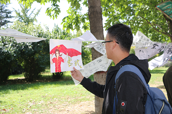 10月10日,组织部于西区雕塑举办展览,展出国庆期间的优秀书画作品。恰逢阳光明媚,秋风送爽,烫金的宣纸上字迹飘逸隽秀,墨香逸散;一幅幅随微风飘荡的绘画作品或满含同学们对祖国的祝福,或印下祖国的繁华盛世、大好河山……路过的同学们纷纷驻足欣赏,很多同学拍照留念。参加了本次活动并成为优秀作品作者的赵元琪同学表示:“本次活动给了我很深的感触,当我将平时存于心中的爱国情感运于笔尖、落在纸上之时,我可以清晰地感觉到那种激情在心中澎湃。我书写了一幅楷书《七律·长征》,寓意伟大祖国走好新时代的长征路,实现中华民族的伟大复兴。”