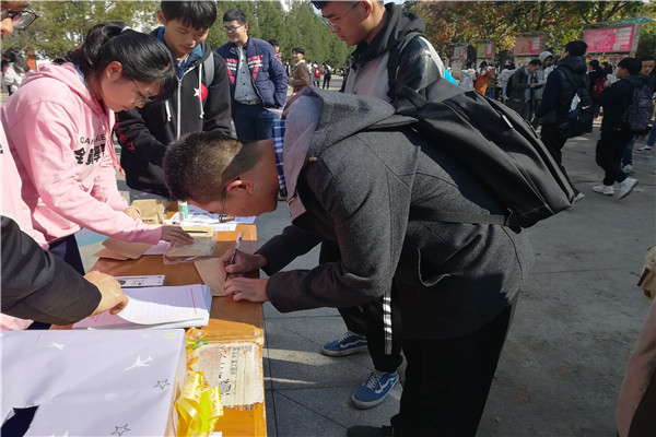 一纸书信表初心,不负韶华一路行。伴着秋日暖阳,过往的同学们纷纷驻足,执起手中的笔用心写下了送个一年后自己的一封信。一位男生在空白的纸页上写下了对未来的期许,“这个活动很有意义,让我重新定义未来,让现在的我不迷茫,希望一年后的自己能够实现今天写下的目标。”熊本熊则向周围的同学发起号召,现场气氛一度达到高潮。同学们趴在书桌上,缕缕阳光倾洒,一位女生将写好的信装到信封,投到信箱中,说道:“写一封信送给一年后的自己,我觉得非常浪漫,为平时沉重的学习生活带来了一抹文学的色彩,陶冶情操。”薄薄纸页传递深情,一场未来之约就此开始。