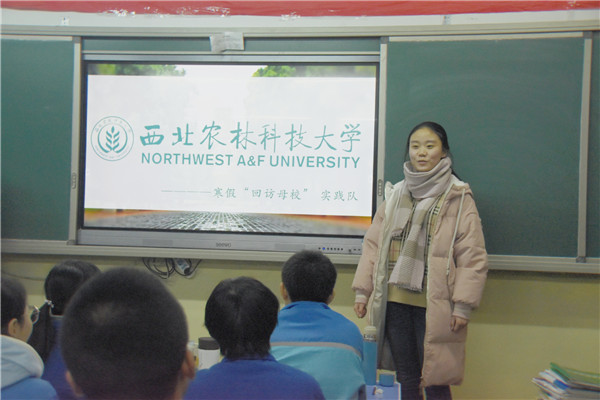 相约二中,情系西农。顶着凛冽的寒风,筹备阶段,队员们购置了精美的带有西农标志的小礼品作为提问环节的奖品,精心制作了PPT和快闪视频,准备了发言稿;在老师空闲时间去办公室拜访了恩师,与老师交流了大学的学习生活,感恩老师的教育之情;当晚,在学弟学妹们上晚自习的时间,进班宣讲,向他们讲述了美好的大学生活,并依次就西农校史、人才培养、校园生活等进行了详细的介绍,激励他们在最后的这一百多天里,努力学习,拼一个无悔人生。活动结束后,一名高三学生以消息形式向队员们表达了自己的收获和感谢:“学长学姐,谢谢你们来我们班宣讲。临近高考,各方面的压力让我有点喘不过气来,你们耐心的回答我的提问,给了我很多建议和解决方法,真的让我豁然开朗,重燃对学习的热情,重拾信心,让我知道了在这关键的时期更加不能放松,要全力以赴的为未来而努力。如果有缘,西农等我!”