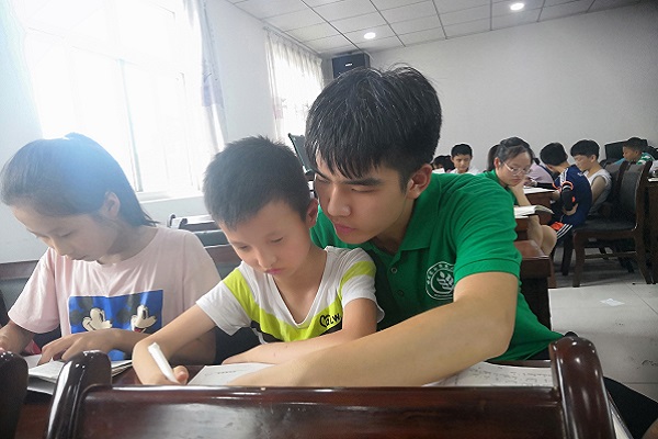 队员们率先进行了自我介绍,又让每一个孩子走上讲台向大家介绍自己。蒋静雅老师的成语课和杜娟老师、赵佳宁老师的英语课都受到了孩子们的欢迎,他们认真地做课堂笔记,秉持着“我喊得最大声我就最认真”的原则,积极回答老师的问题。作业辅导课上,孩子们拿出自己的暑假作业,队员们也一边监督孩子们做作业,纠正他们的坐姿和握笔姿势,一边帮助他们解决一些课业难题。
