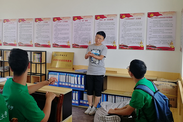 在古里村村委会,队员们遇到了一位驻村扶贫干部,他是西农07级林产化工专业毕业校友。看到队员们的到来,他十分高兴地询问了队员们此行的目标和其他情况,回忆了自己的大学时光和工作经历,鼓励队员们努力学习。随后,他与队员们就古里村的发展情况进行了深入的交流。他首先介绍了古里村的概况,并就近两年国家提出脱贫攻坚口号后村里采取的措施和发生的变化进行了详细的讲述。他重点讲到了古里村在卫生方面的建设,向队员们展示了村里建设的垃圾分类示范站,介绍了古里村的垃圾分类相关政策和措施。
