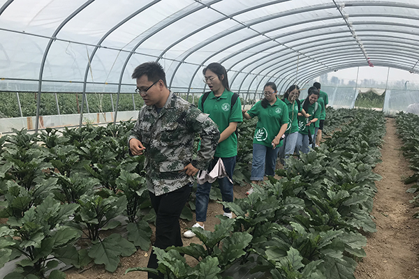 在合作社技术员马天成的带领下,队员们首先来到了西瓜-茄子大棚种植基地。马天成曾毕业于西北农林科技大学,他见到校友来,倍感亲切,热情地接待了实践队,为队员们详细讲解了种植基地的生产经营情况。据了解,该种种植方式是当地近一两年发展起来的新型农业,一年两种,先种西瓜,再种茄子,实现创收。同时,在该乡吴书记的介绍下,队员们了解到,当地政府部门对种植基地也给予了大力支持。为鼓励当地农民积极种植大棚蔬菜,政府采取“盖棚补贴”的政策,在保证了当地农户的基本经济收入同时,也鼓励他们发展特色产业,实现脱贫致富,同时带动当地经济发展。