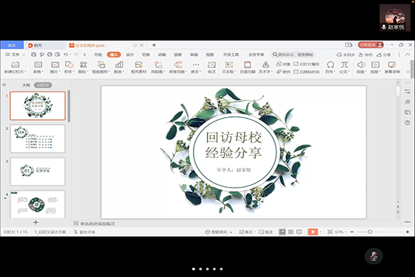 首先,程烨同学分享了回访母校的经验,详细地从前期准备,活动进行、活动总结三个方面介绍回访母校活动,全面的回答了为什么回访、回访是干什么、应该怎么样回访三个问题,最后对素材的准备以及活动环节等过程给出了自己的建议。随后,赵家悦同学进行了自己的回访母校的经验分享。对如何准备,如何宣传进行了细致入微的讲解,让同学们对具体的实践操作有了更加深刻的认识,便于同学们回访母校活动的开展。在提问交流环节中,两位同学和实践部的负责人们耐心解答了如何在线上开展实践活动以及如何撰写实践报告等问题。