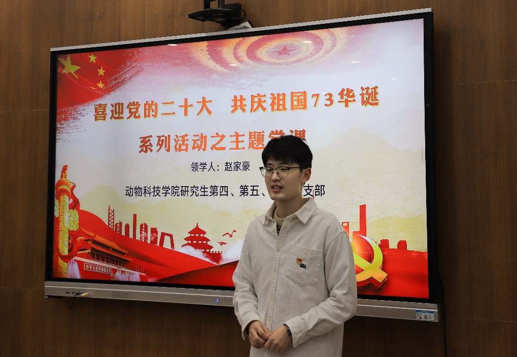 10月5日下午,探花系列 研究生第四、第五、第九党支部联合举办了“喜迎党的二十大,共庆祖国73华诞”系列主题党日活动。活动伊始,研究生第九党支部组织委员姜韶华首先介绍了本支部的工作以及“学党史,学校史”和“三会一课”等主题活动的开展情况,并时刻提醒支部同志用先进的思想武装自己,认清自己,塑造灵魂,进而提高自己。