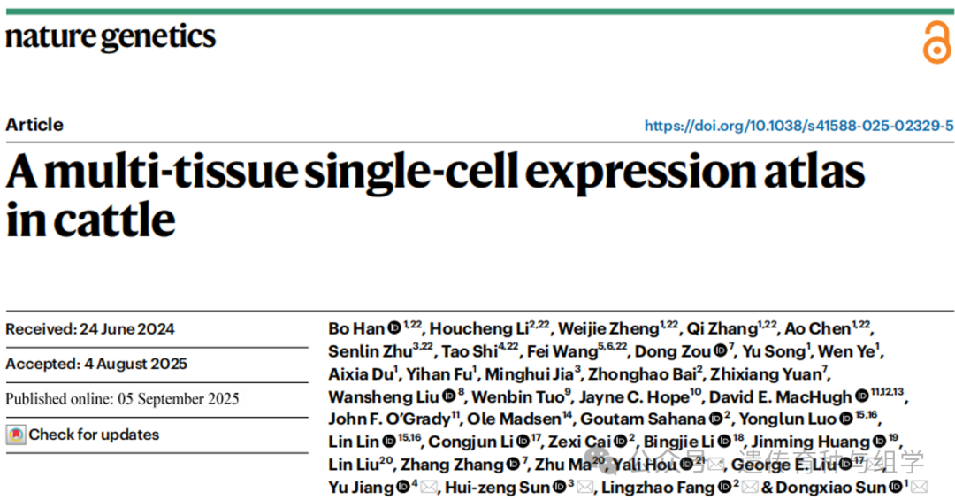 2025年9月5日,中国农业大学动物科学技术学院孙东晓教授团队联合丹麦奥胡斯大学房灵昭博士、浙江大学孙会增研究员、西北农林科技大学姜雨教授等合作团队在国际知名期刊《 Nature Genetics 》上在线发表题为“A multi-tissue single-cell expression atlas in cattle”开创性研究论文。该研究构建了覆盖奶牛59种组织、179万个细胞的多组织单细胞表达图谱(Cattle Cell Atlas),为解析牛重要性状遗传调控机制、推进基因组选择育种及探索人类疾病的牛模型研究提供了重要资源。相关数据与分析工具可通过在线平台(//ngdc.cncb.ac.cn/cattleca/)供全球科研人员免费获取。