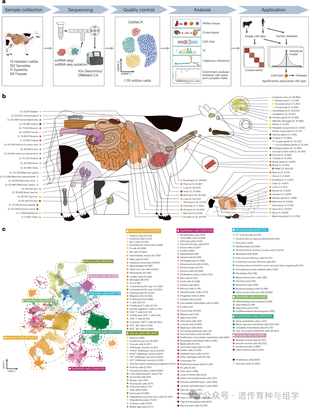 该研究率先采用单细胞转录组策略,对15头荷斯坦奶牛(含胎儿、犊牛及成年公牛和母牛)的59种组织进行深度测序,最终筛选出 179万个高质量细胞,成功注释出131种细胞类型,涵盖免疫细胞、内皮细胞、上皮细胞、基质细胞、神经细胞、肌肉细胞和生殖细胞7大细胞谱系。